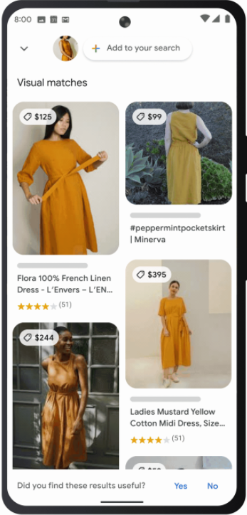 新功能将帮助 Google 提供更为精确且有效的搜索结果。举例来说,如果用户看上了一条裙子,但是不喜欢它的颜色。这时用户就可以上传这条裙子的照片,同时在搜索栏输入文本“绿色”,来寻找自己想要的款式。