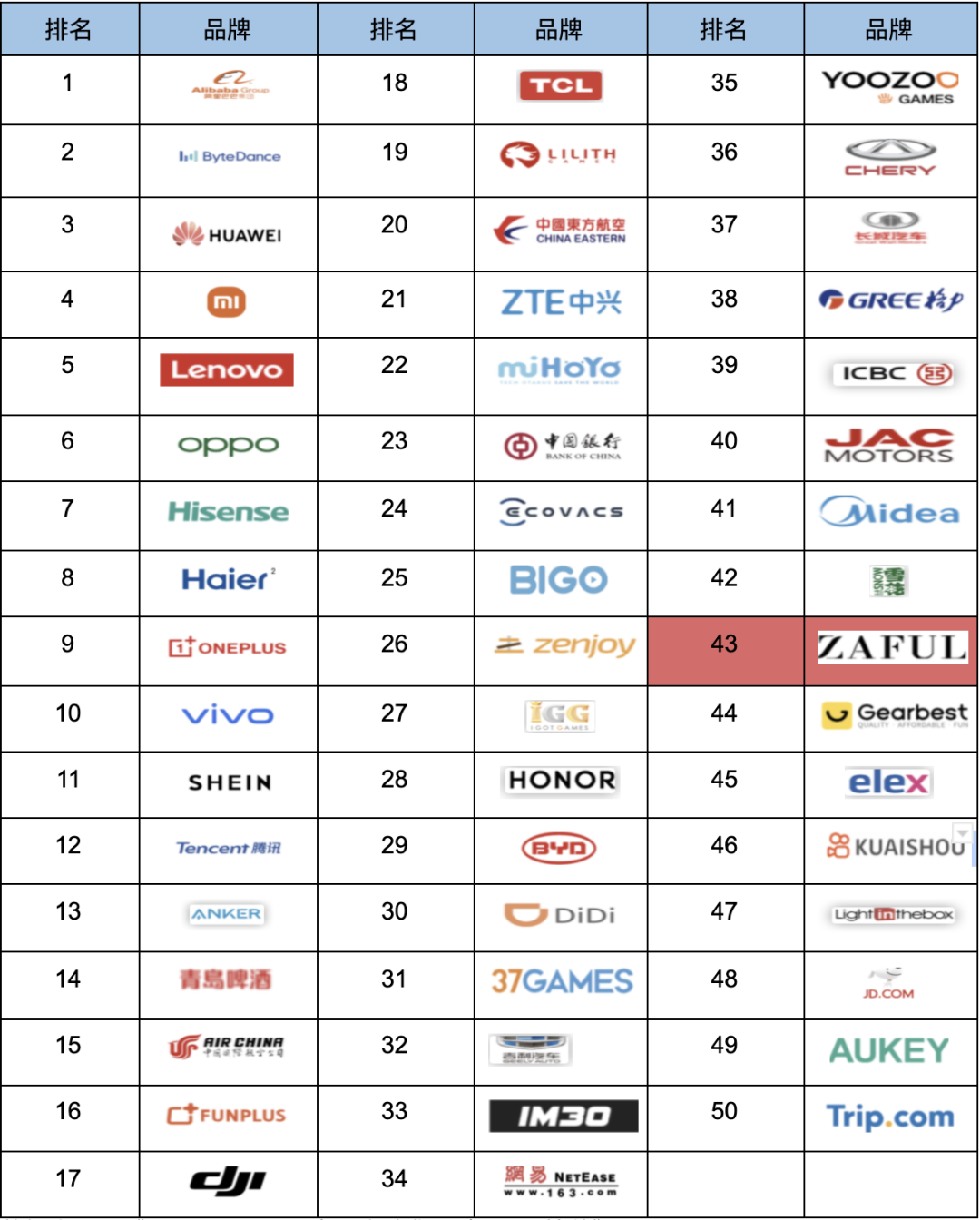 在《年度 BrandZ™ 中国全球化品牌 50 强》榜单中,ZAFUL 多次荣登上榜,2021 年,以综合排名第 43 位的成绩再次登榜。在全球线上快时尚榜单中,ZAFUL 位列第二,仅次于 SHEIN。