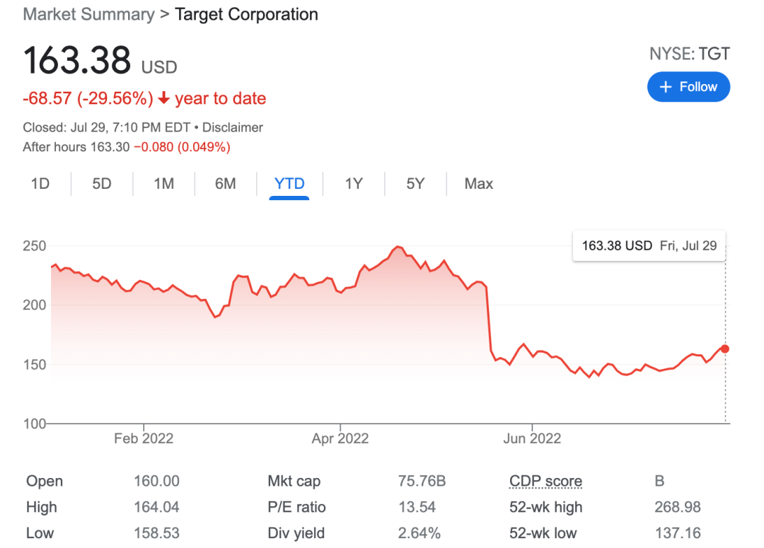 美国知名零售企业 Target,今年的股票跌幅都高达 30% 左右,可见投资者对零售企业目前的预期并不乐观。