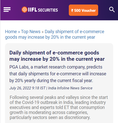 市场研究公司 PGA Labst 预测,在本财年,印度电商日出货量预计将以每年 20% 的速度增长。与过去两个财年相比有所下降。