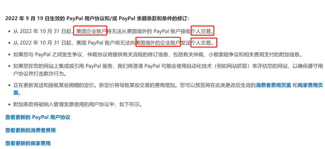第一条,“美国企业账户将无法从美国境外的 PayPal 账户接收个人付款(“个人交易”说成“个人付款”可能比较好理解)”。