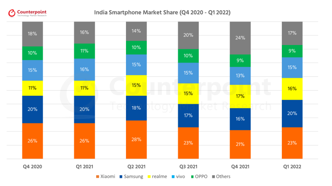 根据 countepoint 调研显示,自 2020 年 Q4 季——2022 年 Q1 季度,印度智能手机市场占有率的前五名的品牌中,realme 的增速最快,已经占据了第三名的位置。