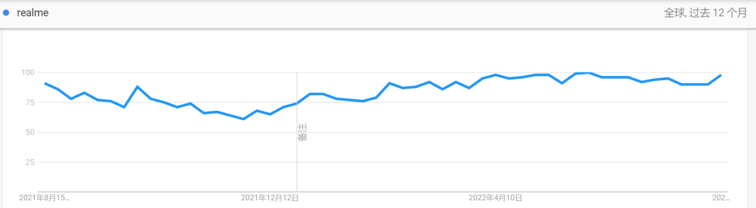 realme 能够快速占领海外市场,除了产品本身,其病毒式媒体和社交营销活动也是其中一大亮点,通过数字营销手段,增加了品牌知名度的提升,据 Googletrends 显示,在全球范围内有关 realme 的搜索,持续保持高位,尤其从 2022 年 2 月起,搜索热度将达到最高值。