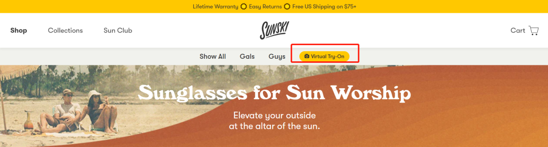 Molly 查看他们的独立站 sunski.com,通过网页源代码发现是通过 shopify 进行建站服务。整体网站设计很有自己的营销风格,对于我这种新访客来说,首次的用户体验挺令人深刻的。我将从一名访客的角度,具体描述进到其独立站的使用感受,可提供些许借鉴的亮点。