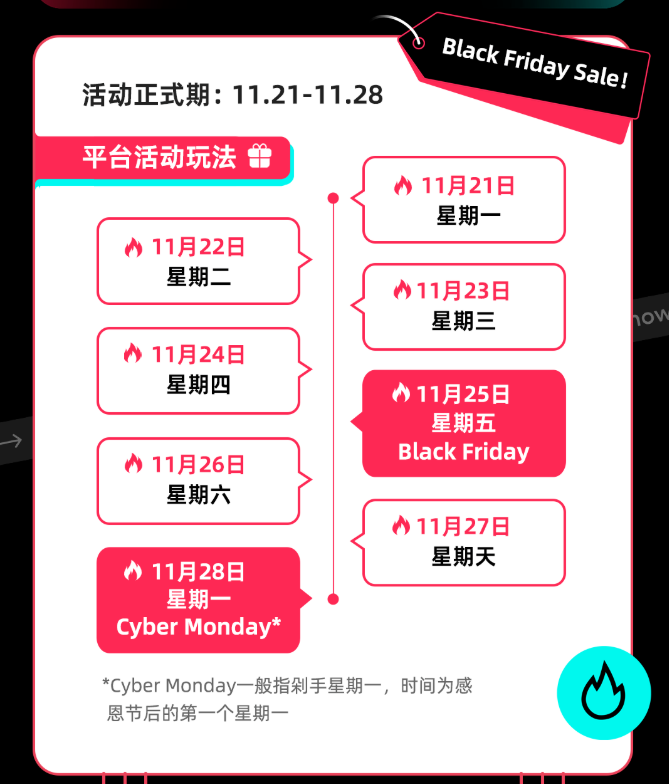 此次大促活动正式期为 11 月 21 日至 11 月 28 日,其中,11 月 25 日是 Black Friday,而 11 月 28 日是 Cyber Monday。