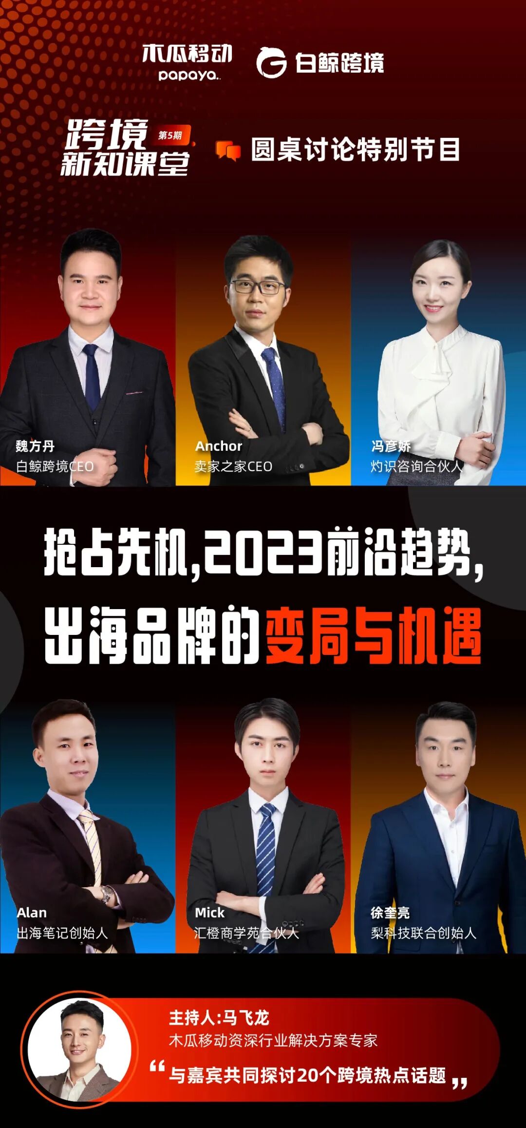 近日,木瓜移动联合白鲸跨境,开展一场以「抢占先机,2023前沿趋势,出海品牌的变局与机遇」为主题的跨境新知课堂圆桌讨论特别节目,木瓜移动资深行业解决方案专家马飞龙担任节目主持人,并邀请到白鲸跨境 CEO 魏方丹、汇橙商学苑合伙人 Mick、出海笔记创始人 Alan、灼识咨询合伙人冯彦娇、卖家之家 CEO Anchor 和梨科技联合创始人徐奎亮等跨境圈专家。