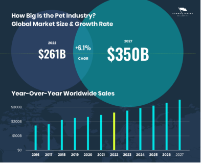 Statista 报告显示,家居宠物用品的线上购物渠道增幅最高,预计 2021 年至 2026 年将从 938 亿成长为 1644 亿美元,5 年内增幅将达到 43%。Common Thread 的报告显示,宠物护理市场支出在 2022 年增长至 2610 亿美金。预计 2027 年将达到 3500 亿美元。