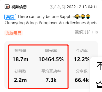 通过嘀嗒狗数据可以发现,这条视频是由 TikTok 博主 @sapphie_the_pomsky 在 12-13 发布的,博主定制了一个与 Sapphie(宠物名)一样的玩具放在它面前,但是她感觉对方是另一只狗,跟它打了一架,并且表现得很生气,该视频发布后已经获得了 1870 万播放,220 万的点赞量,分享数超过了 6.6 万。