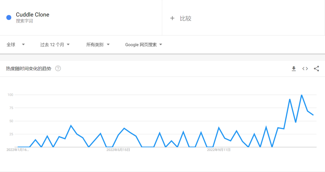 从下方搜索趋势不难看出,当前全球地区关于“Cuddle Clones”的搜索热度从 2022 年 1 月到 11 月都在 50 以下,而在 12 月大幅提升并达到峰值,这从侧面反映了最近“Cuddle Clones”产品的需求在 TikTok 热度催化下,使更多人关注到宠物克隆纪念品,需求也在上升。