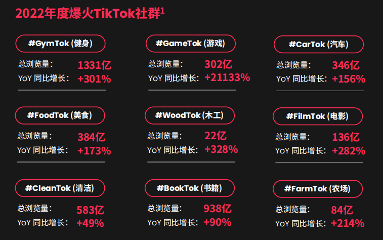 以“BookTok(书籍)”为例来说,该社群总浏览量达 938 亿,与去年同期相比增长 90%。