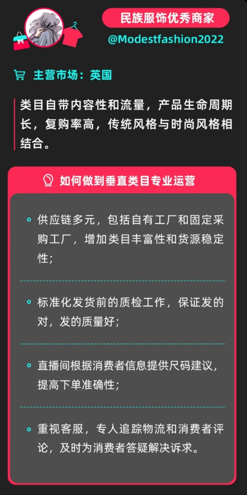 服饰店铺 Modestfashion2022 拥有自有工厂和固定采购工厂,大大保障了其品类丰富性及货源稳定性。在“有好货”的基础上,商家还很重视消费者购物体验,在消费者拍下商品前,在直播间根据消费者信息提供尺码建议,提高下单准确性,在订单生成后标准化质检工作,确保发货的准确度。并安排客服追踪物流及评论,为消费者答疑解惑。“好产品、好内容、好服务”助力该商家打造了生命周期长、复购率高的大单品,赢得了生意突破性增长。