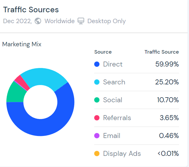 流量来源 59.99% 来自自然访问,25.2% 来自搜索流量,10.7% 来自社交流量,其中还有少量的外链、邮件营销和未被充分利用的显示广告。其中付费流量占比 73.41%,自然流量占比 26.59%。