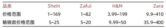 目前,SHEIN 销售“中国便宜服装”的定位,已经深入到欧美消费者心智之中。其服装价格范围,低于同行竞对 H&M 和 Zara。其畅销款,可以明显看出差距,SHEIN 畅销款的价格带为 5-25 元,远低于 H&M(9.99-50 元)和 Zara(35.9-400 元)。