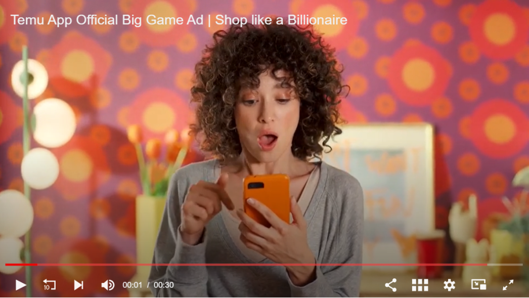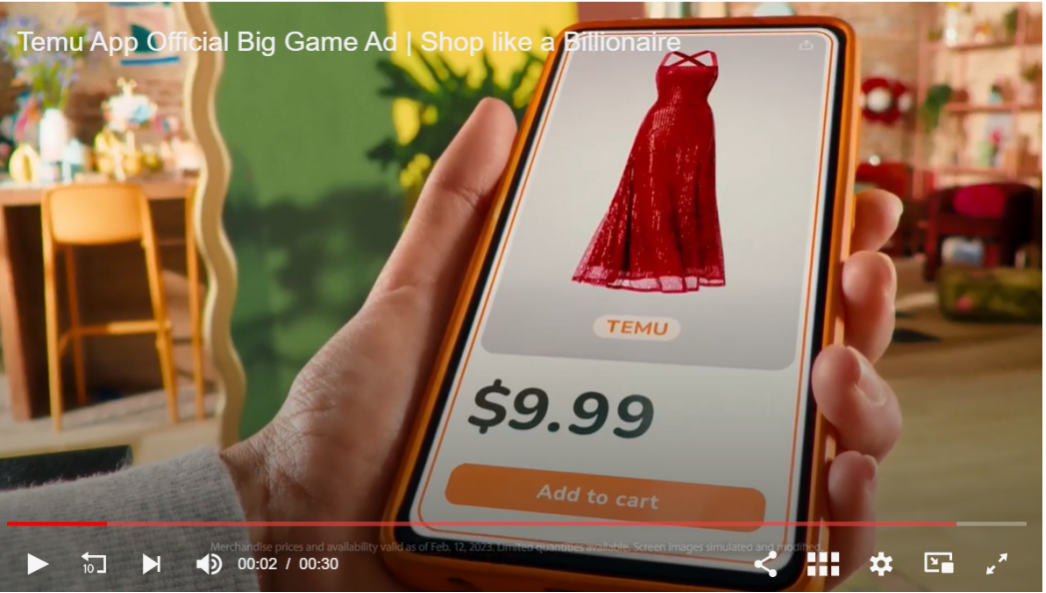 在刚刚过去的全美橄榄球总决赛“超级碗”上,Temu 斥资 1 亿买了 60 秒的广告,将其“低价定位”进一步扎入到美国人的心智中。