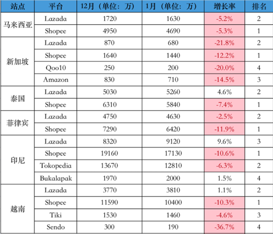 1 月 7 日,数据分析网站 Similarwed 发布了 2023 年 1 月份东南亚各电商平台访问量及相关数据: