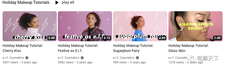 e.l.f 在 YouTube 上共积累 11 万左右粉丝,其发布的主要内容大都围绕着其产品的妆教展开:
