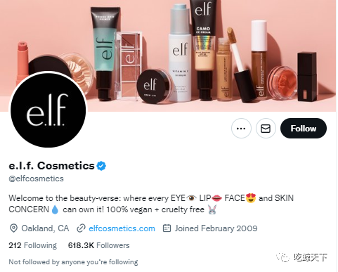 e.l.f. 在 Twitter 上共累计 62 万粉丝,其发布的主要内容为产品的宣发,节假日的一些互动文案,以及与一些网红合作的宣发等等。
