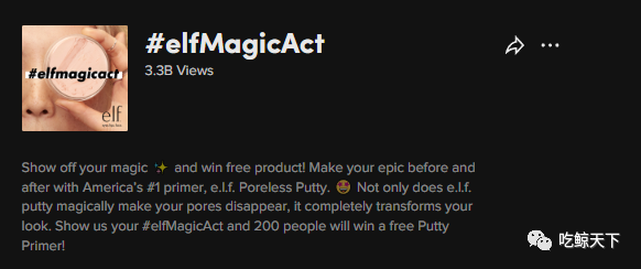 此外,e.l.f. 还发起新挑战活动 #elf Magic Act(elf魔术),邀请用户以品牌 8 美元的妆前隔离作为魔法棒,把自己脸上的毛孔等瑕疵“变消失”,并在活动主页面附上了产品购买链接。截至 7 月 31 日,有超过 75 万支短视频使用了 #elf Magic Act 标签,该标签相关视频的累计观看量已经超过 17 亿。