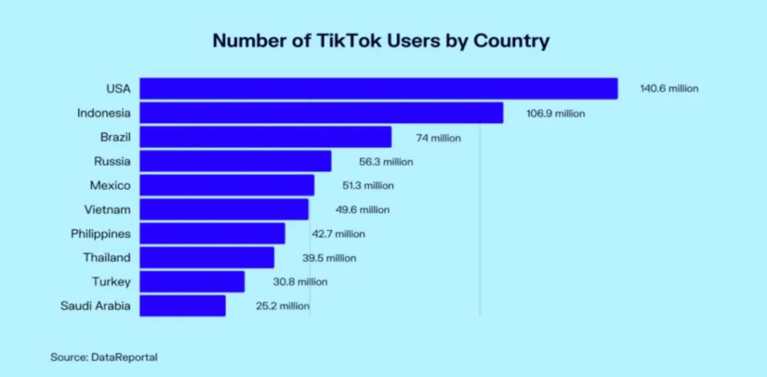 (TikTok 用户在各国市场分布情况,来源:DataReportal)