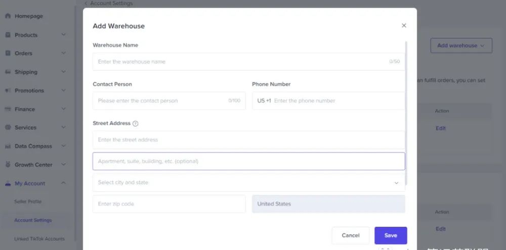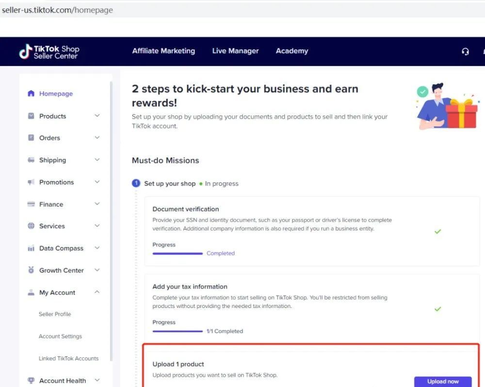 当我们拿到美国闭环小店后,TikTok 美国闭环小店第一步要做的不是上传产品,而是去设置仓库,虽然我们的界面会出现提示要求我们上传一个商品,但是其实这是个坑,因为当你点击要上传产品后,他就会跳出提示,提示你只有设置完仓库,才可以上传产品。