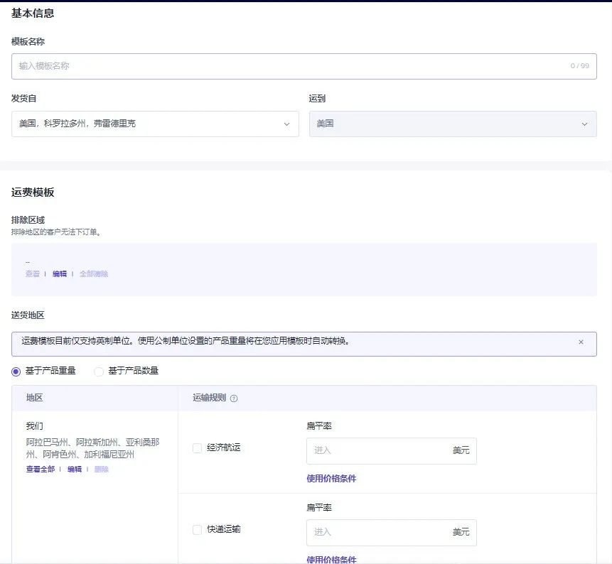 第二步在我们设置完仓库后,还需要去设置运输模块才可以去上传产品,运输模块的设置也比较简单,主要是为了更好的收取包裹运费,需要注意的是,目前允许我们选择三种物流方式,经济,标准,快速运输,这个可以选择全部开启,也可选择只开一个,可以设置根据产品重量收费,也可以设置根据产品数量固定运费,当然具体的运费价格可以和我们使用的海外云仓服务商沟通获取到美国准确的本土运费价格。