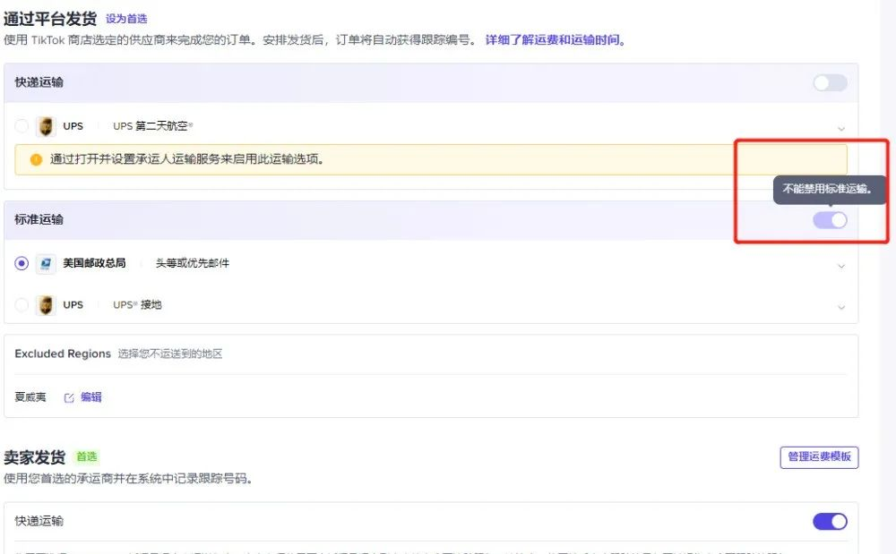美国闭环小店可以选择通过平台发货也可以选择卖家自主发货,但是有个比较重要的就是平台发货目前一旦开启了就不能关闭了,同时如果使用商家自发货,要注意的就是,运费设置模块中,一定要把美国一些偏远地区关闭或者单独设置运费,这些偏远地区比如夏威夷这样的小岛,往往运费都比普通地区运费贵上很多。