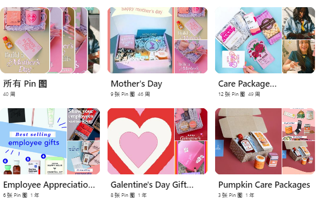 Happy Box 也意识到, Pinterest 视觉社交的本质与其品牌和商业模式相吻合,所以他们也会在该平台通过不同主题的 boards 来为不同的场合推荐礼物创意。