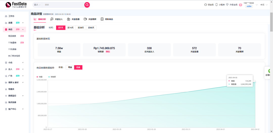 近7日(3.27-4.02)TikTok 小店 SYB 销量达 7.85 万,销售额约为 Rp181 万,上架商品 2 个,新增关联达人 590 位,关联直播 952 场,关联视频 1968 则。4 月 1 日当日销量超 1.8 万。