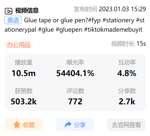 进一步了解该账号更新的种草视频,可以看出关于“点胶笔”的视频播放量都相对较高,在几万到千万之间。