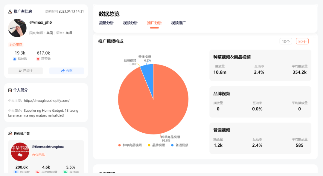通过观察 @vmax_ph6 的主页,不难发现该账号专注于分享各类文创产品,其中种草视频的占比为 93.8%,平均播放量为 35 万,评论互动率为 2.4%。当前账号的更新频率为几天一更。