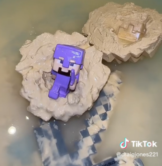 博主将盲盒玩具放入一盆清水中,随着浸泡时间的延长,盲盒材质逐渐开始溶解,这个时候博主的“十八般武艺”就派上了用场,博主拿出小凿子、铲子等各种工具,凿开盲盒坚硬的外壳,挖掘出藏在盲盒深处的宝藏。