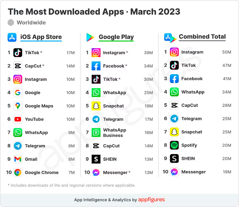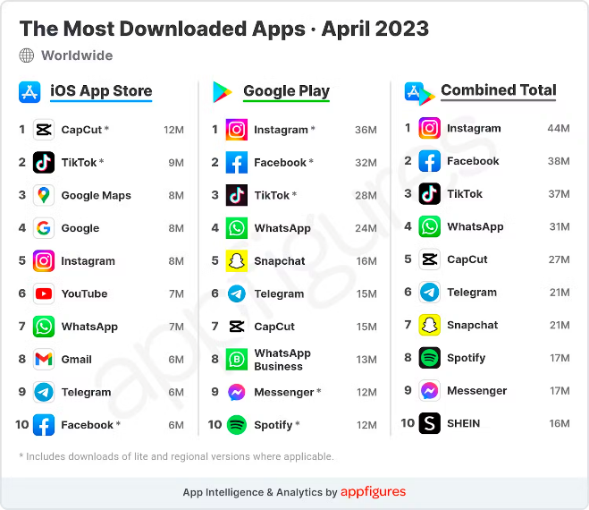 根据 App Intelligence 发布的 2023 年 4 月全球非游戏移动应用下载量排名显示,Instagram 依然是 4 月全球综合下载量最高的应用程序,与前几个月保持一致。其以 4400 万次的新增下载量位居总榜第一,以 3600 万的新增下载量位居 Google Play 排行榜第一。