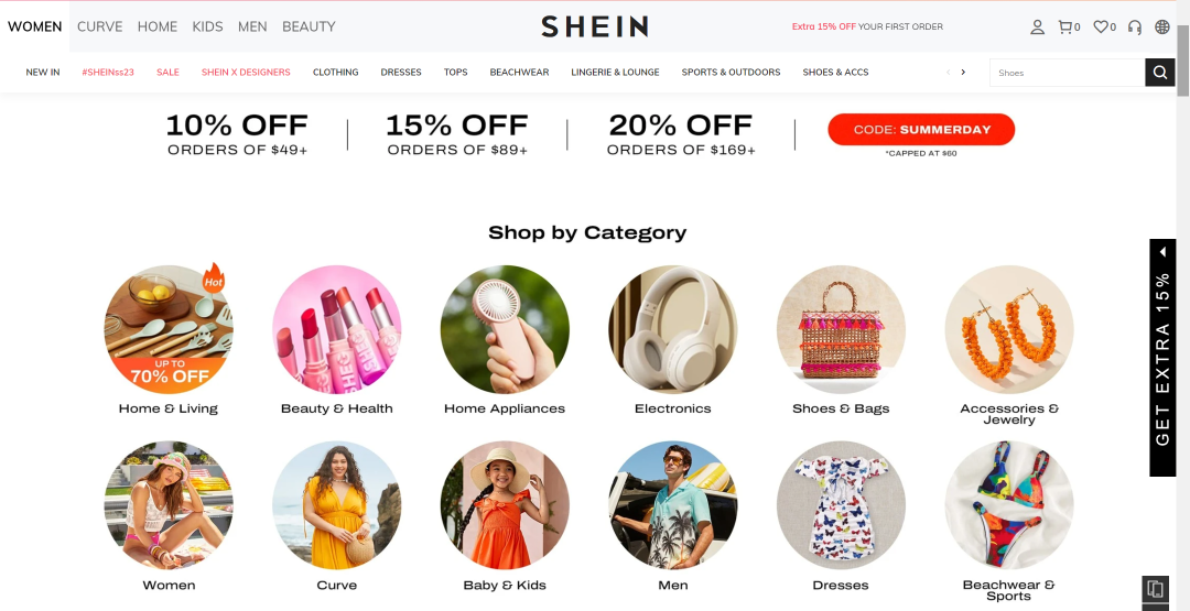 在浏览 Shein 美国站时发现,除了服装和鞋包,家居、美妆、电子产品、珠宝首饰等类目也赫然展示在页面靠前位置,未来 Shein 面向第三方卖家的招商或将围绕这些类目进行展开。