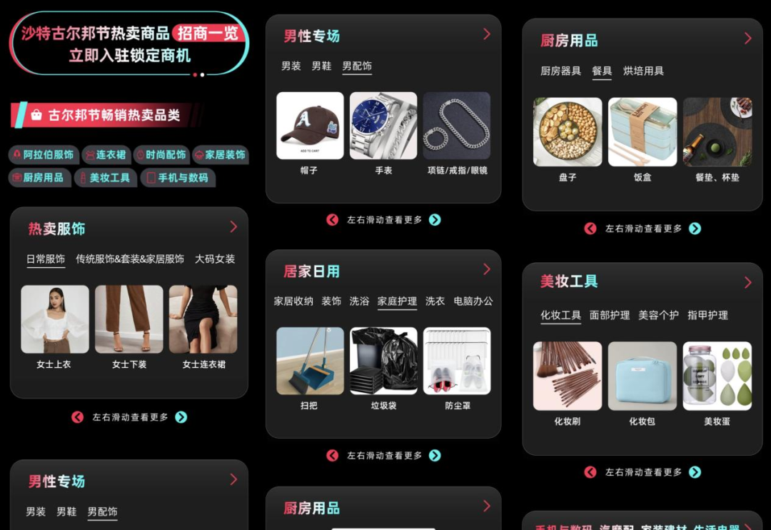 古尔邦节是沙特阿拉伯传统购物高峰期之一,人们喜欢互赠礼物、或购买如服装、电子产品和各种古尔邦节特色商品来庆祝节日。对于女士们,优雅的长袍、凉鞋和配饰等展现魅力的时尚单品将成为节日消费的“宠儿”。在 TikTok Shop 跨境电商公布的热卖商品招商信息中,可以看到女士日常服饰、传统服饰和套装、家居服、大码女装、女鞋女包、时尚配饰等商品都在大力招商。