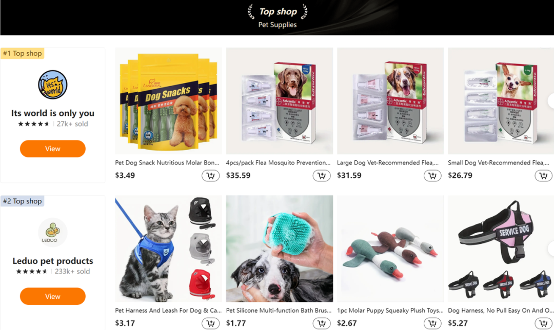 每个类目下的店铺排行榜筛选出了综合情况最好的店铺,以宠物用品为例,排名第一的商店销量高、评分高,店铺的装修也更加美观。此外,消费者在商品详情页可以看到店铺名称,在店铺主页可以点击关注,以方便回购。