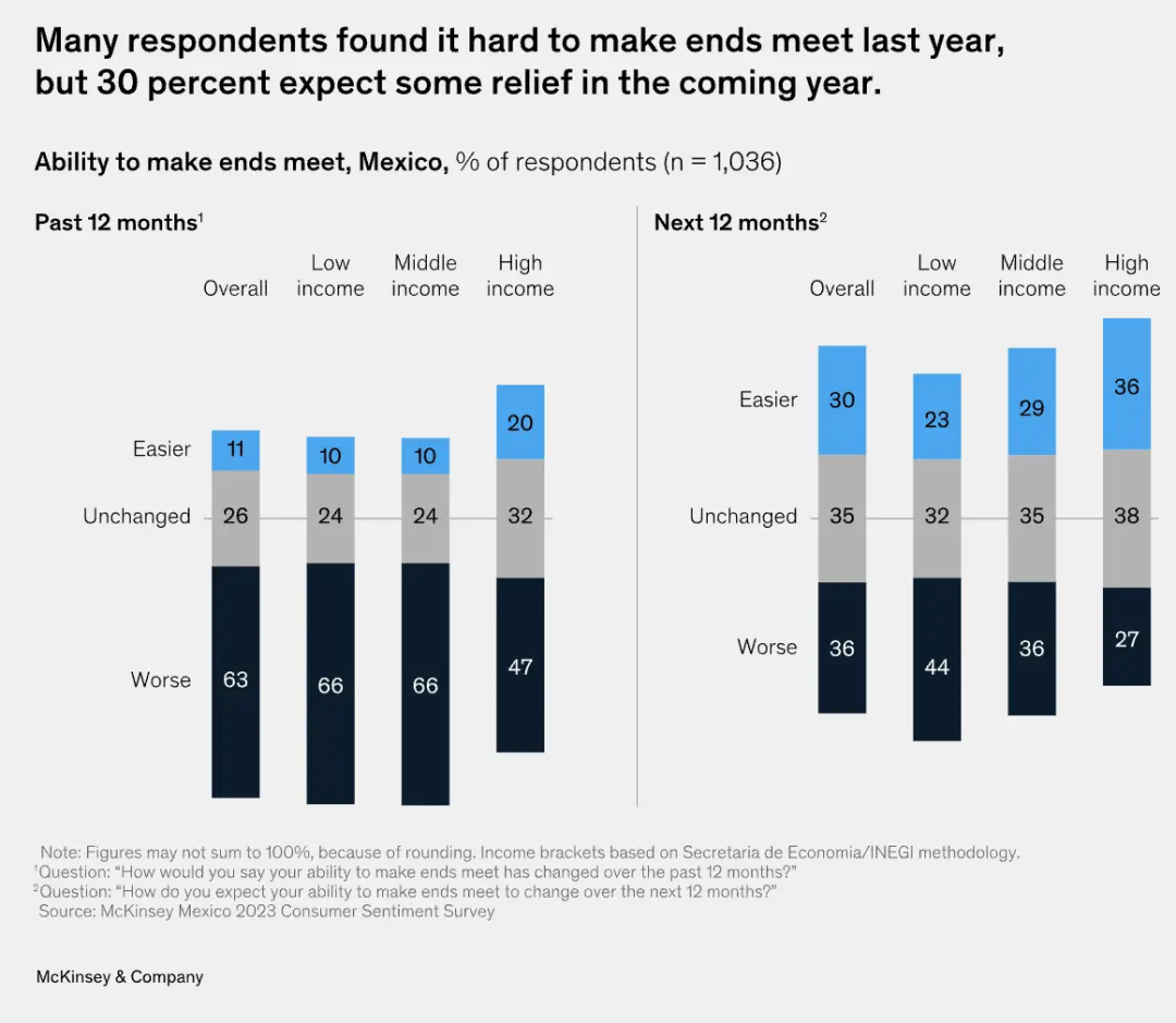 近日,麦肯锡发布了 2023 年墨西哥消费者调查结果,该调查对 1000 多名不同收入群体的墨西哥消费者进行了访问研究。调查显示有 30% 的墨西哥消费者预计今年的财务状况要好于去年,在经济上宽裕了后,消费者自然会更愿意消费。