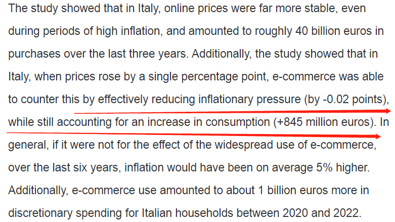 来自 Ambrosetti 与亚马逊合作进行的一项研究发现,电商行业的繁荣兴起对意大利的经济发展产生了积极影响。换句话说,如果意大利没有电子商务的影响,那么其在过去六年里的通货膨胀率会比现在平均高出 5%。