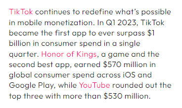 来自 Data.ai 的一份报告显示,2023 年第一季度,TikTok 的消费者支出已超过 10 亿美元,成为了全球首个单季度用户消费超 10 亿美元的应用程序。截至目前,TikTok 全球下载量已突破 35 亿次,是继 Facebook 之后第二个下载量突破 30 亿次的应用程序。TikTok 用户更是展示强大的消费能力,目前在 TikTok 上的消费已经超过 70 亿美元。