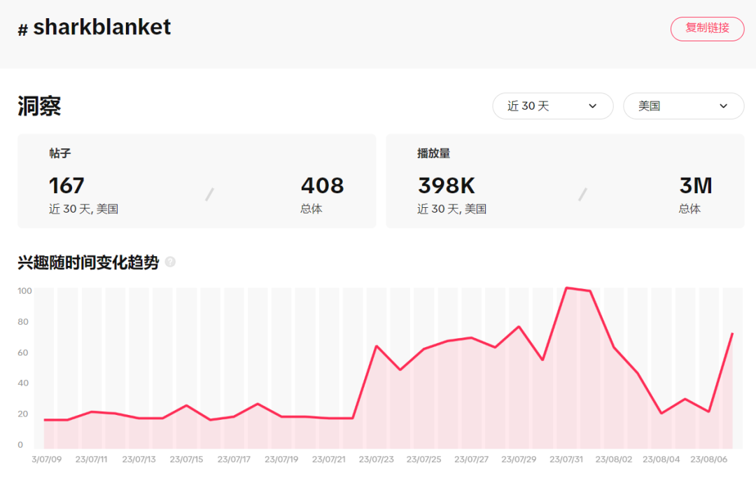 目前,TikTok 上搜索与 Shark Blanket 相关的视频浏览量已达到 22 亿次。此外,根据 TikTok 官方话题数据显示,#Shark Blanket 的话题热度在近 30 天内也在不断拔高,TikTok 不少卖家发现了鲨鱼毛毯的热度后,纷纷蹭其热度做素材进行带货,几乎都赚得盆满钵满。