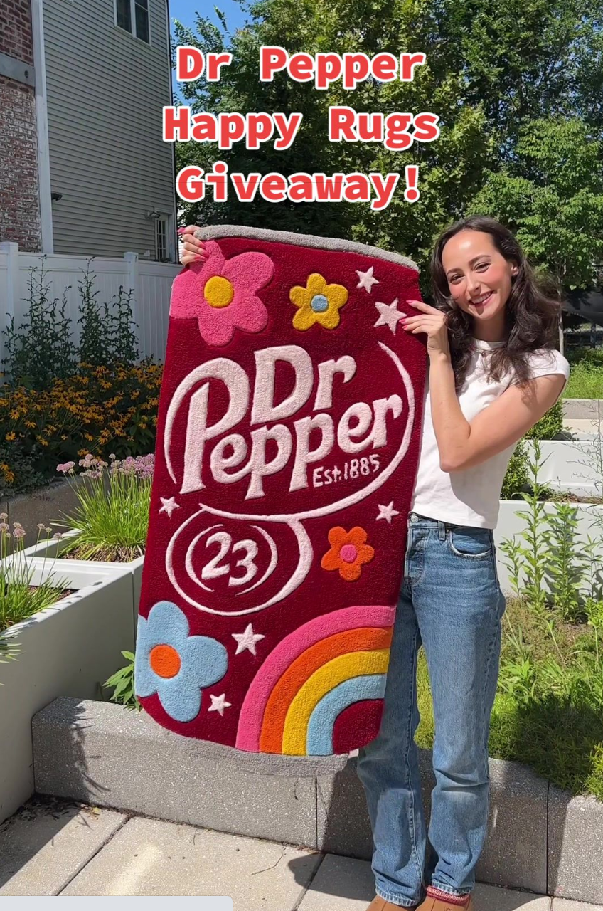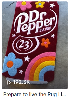 在最近上传的一则和饮料品牌 Dr Pepper 的合作广告视频中,马德琳以饮料瓶图案作为设计,制作了一块色彩鲜明,略显俏皮的簇绒地毯。观众只要关注饮料品牌 Dr Pepper 的 TK 账号,点赞评论就可以参与抽奖,幸运获奖者将获得这块地毯。
