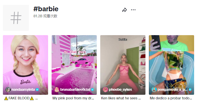 《芭比》首映 3 天票房达到 1.55 亿美元,打破了新片首周末票房纪录。在 TikTok 上,话题 #barbie 有 812 亿次浏览,#pink 有 490 亿次浏览,#barbiegirl 有 177 亿次浏览。