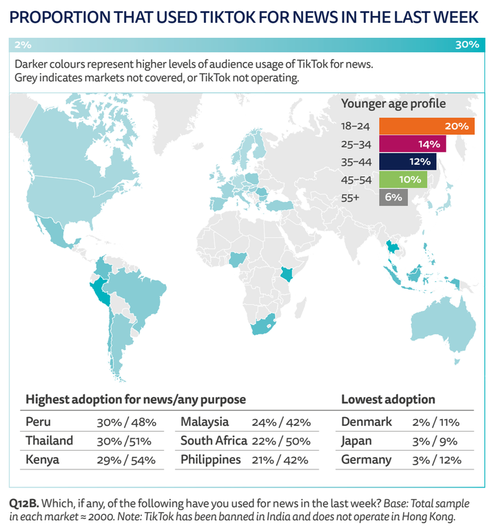 (肯尼亚 TikTok 使用量占比达 54%,图源:2023 年数字新闻报告)
