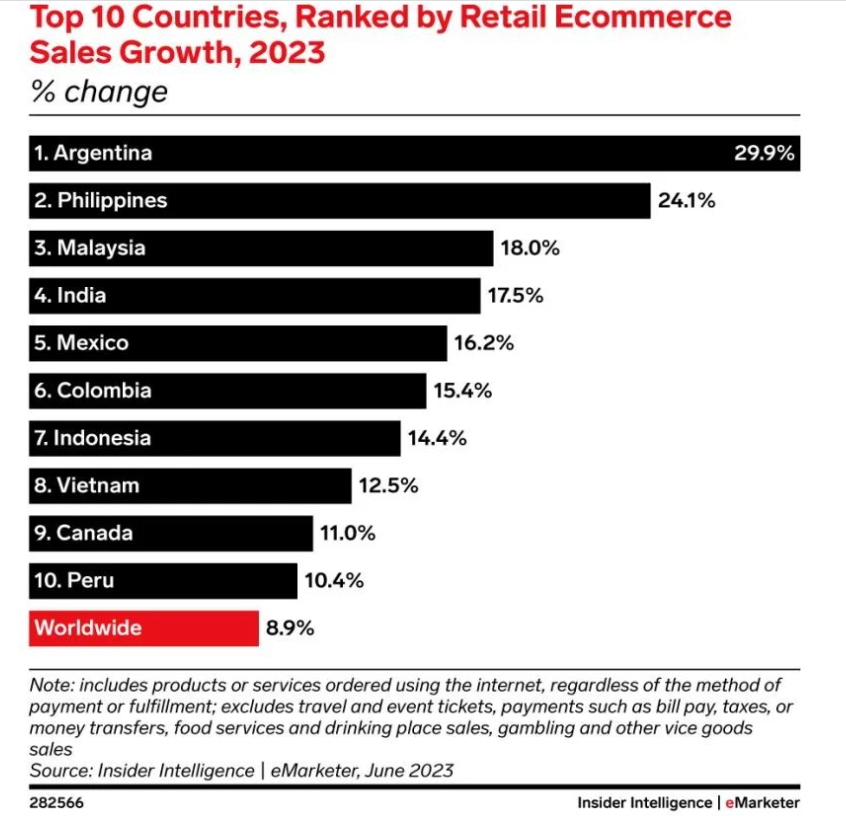 (电商市场规模增速前十的国家,图源:eMarketer)