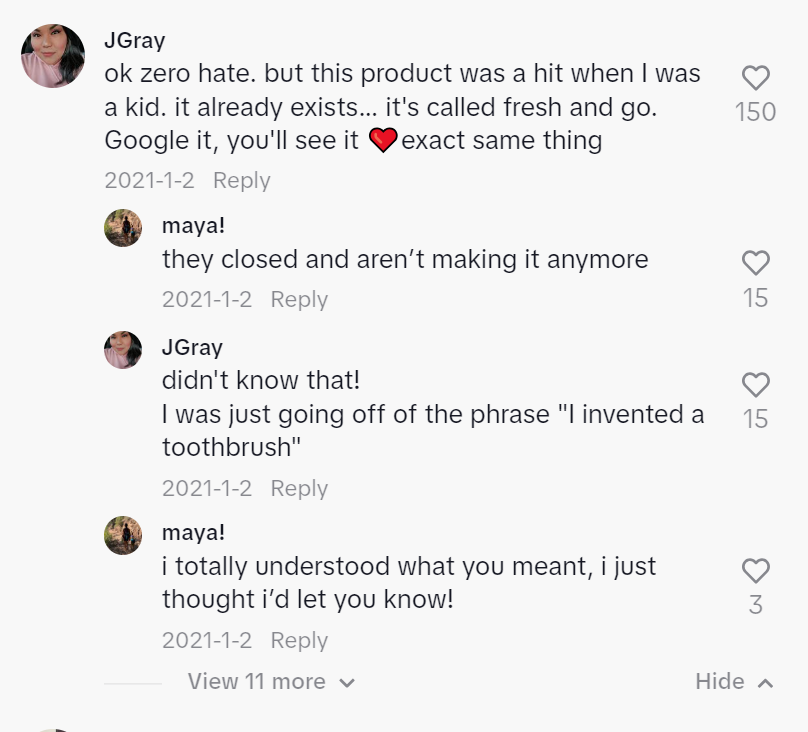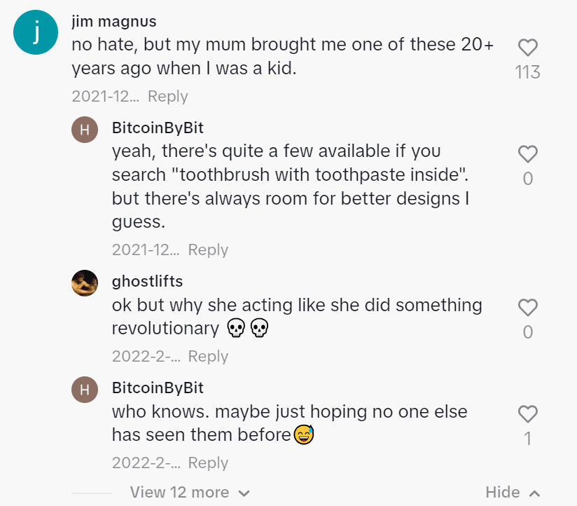 一位网友说:“不是黑粉,但是在 20 年前当我还是小孩的时候,我妈妈就给我买过一个类似的产品。” 另一位网友附和到,“是啊,如果你搜索关键字 ‘能填充牙膏的牙刷’,你会找到一些市面上的产品。当然,在设计上还是有优化空间。”