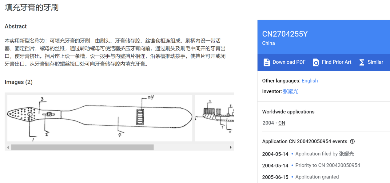 如果将产品关键字 Refillable toothbrush 加上专利 patents 在谷歌搜索,我们还会找到不少已经注册专利的类似产品设计。