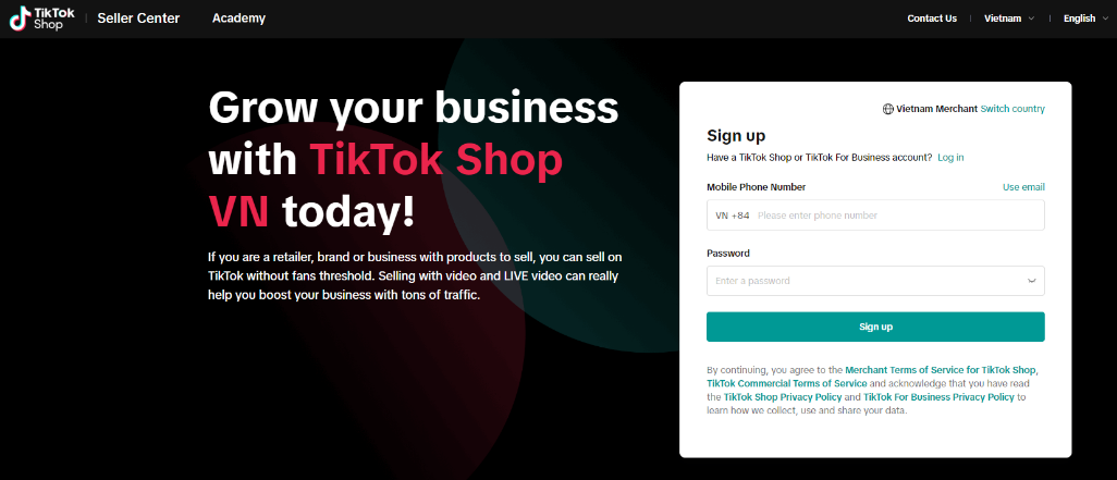 (TikTok Shop 越南站入驻通道,图源:TikTok Shop)