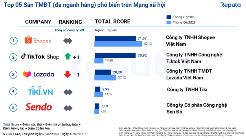 伴随着 TikTok Shop 在越南市场的不断崛起,平台受欢迎程度也逐渐升高。据 Reputa 发布的今年 7 月份越南社媒渠道电商平台受欢迎程度排行榜称,TikTok Shop 以 70.92 分的成绩赶超 Lazada,位列第二。