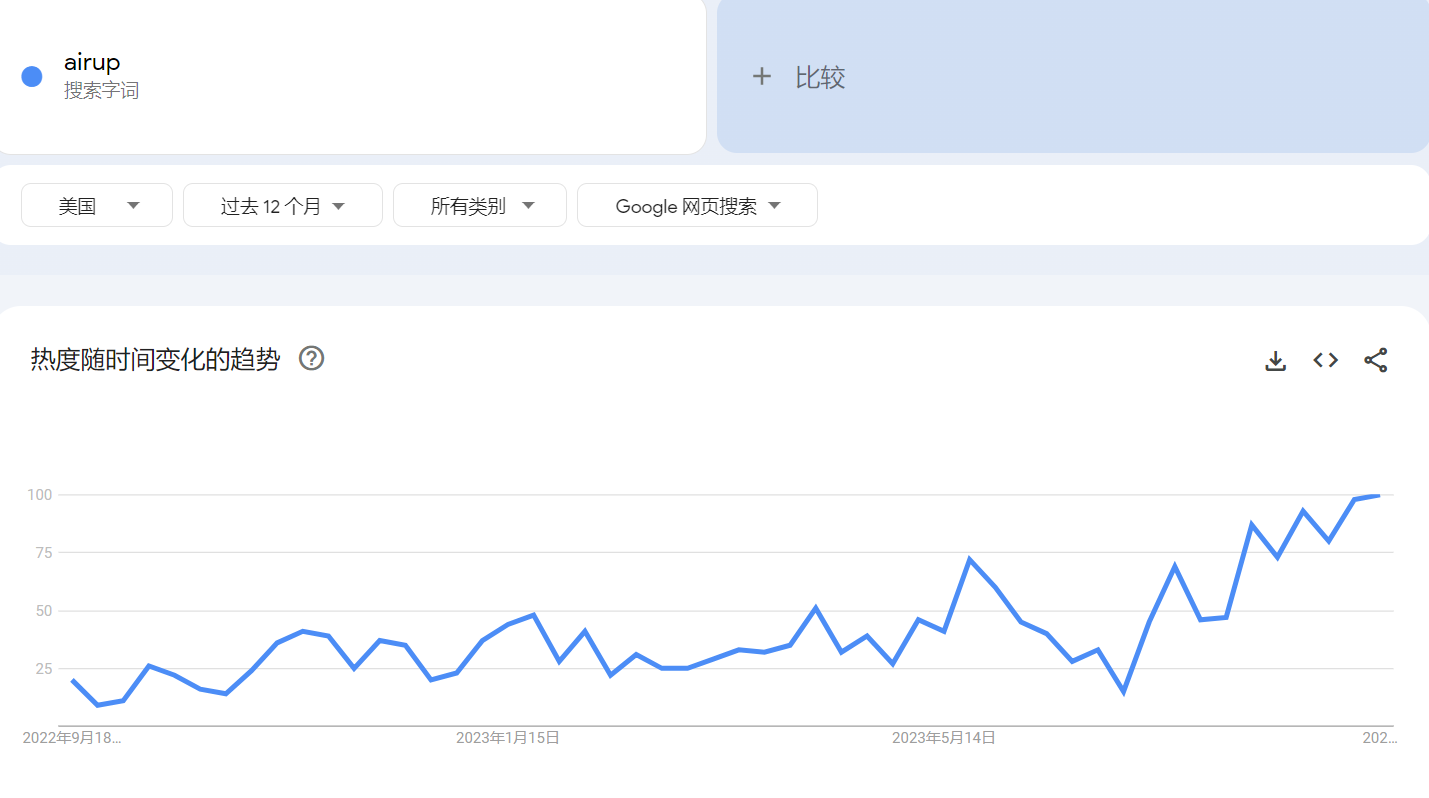 从下方搜索趋势不难看出美国地区关于“airup”的搜索热度在 5 月前起伏并不明显,并且在短暂的上升后下降,而 6-7 月开始呈现上升趋势,根据预测该关键词的搜索热度在近期会上升到峰值 100。