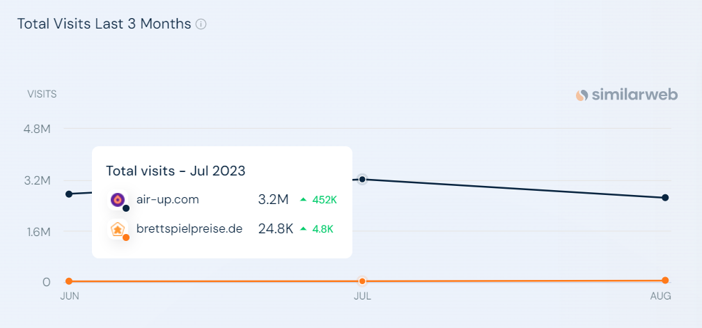 air-up.com 网站七月份的流量为 320 万,而八月份是 280 万,品牌受众中男性占 60.42%,女性占 39.58%。最大的游客年龄组是 18-24 岁。air-up.com 的最大流量来源是直接流量,占上个月桌面访问量的 35.4%,社交排名第二,占流量的 25.3%。