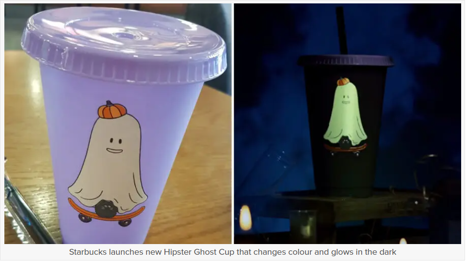 例如在几天前,非常擅于利用节日营销炒作的星巴克同样推出了一款夜光 Hipster Ghost 可重复使用变色杯,虽然它乍一看就像一个普通的杯子,但当你将冰冷的液体倒入其中时,杯子会变成漆黑。